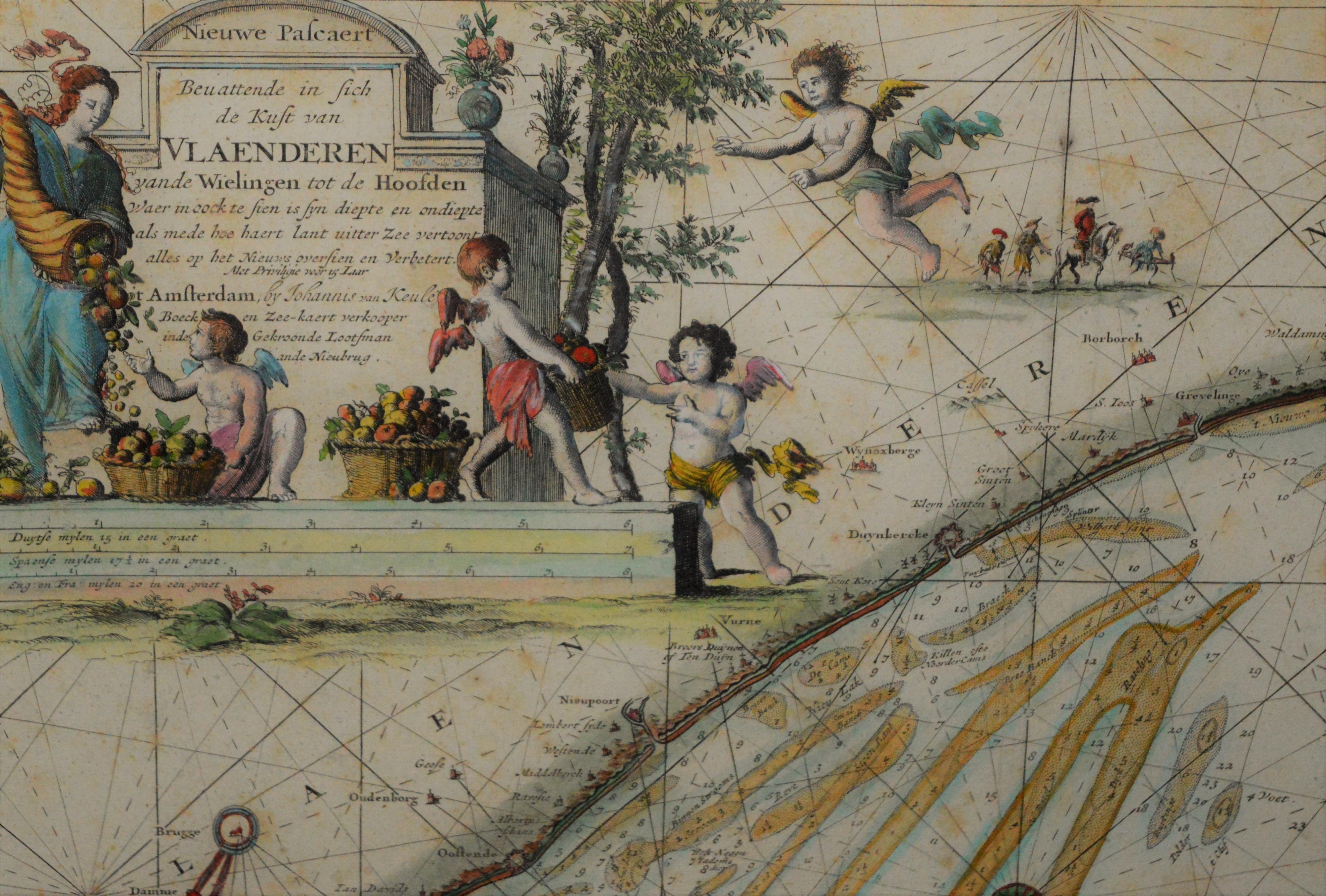 Eén van de nieuwste aanwinsten in de collectie van het NAVIGO-museum is deze prachtige zeekaart van de hand van Johannes Van Keulen. De kaart - met de welluidende titel ‘Nieuwe Pascaert Bevattende in sich de Kust van Vlaenderen vande Wielingen tot de Hoofden’ - dateert uit 1680 en is een kopergravure die met de hand ingekleurd werd. We zien de kust van Vlaanderen (van net ten zuiden van Calais tot de Westerschelde), de monding van de Schelde, en ook het westen van de kust van Engeland (van Dover tot Margate) komt mee in beeld. In het midden van de kaart oriënteert een windroos het noorden naar de onderkant van de kaart. De gravure is verder versierd met een zeilgaljoen en een allegorische ‘titelcartouche’ met een hoorn des overvloeds en verschillende cherubijntjes met manden met fruit.