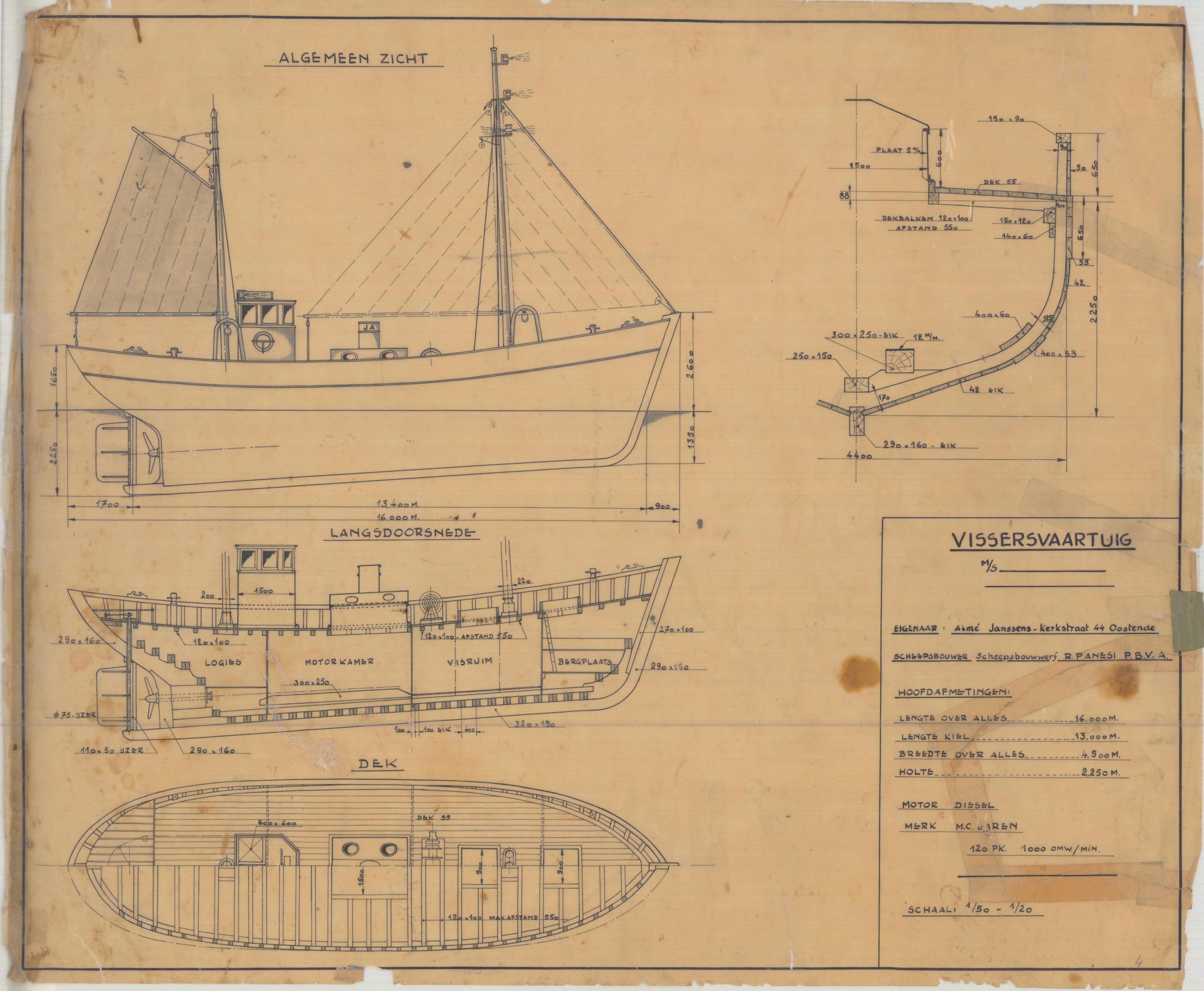 Dit plan van een kusttreiler, gebouwd in opdracht van Aimé Janssens aan het begin van de jaren 1940, is afkomstig uit het archief van de Oostendse scheepswerf Panesi. De geschiedenis van deze scheepsbouwersfamilie gaat terug tot 1824, toen de Italiaanse Andreas Panesi (1792-1868) zich in Oostende vestigde. In de voetsporen van zijn vader, de Genuese scheepsbouwer Benedictus Panesi, installeerde Andreas zijn eigen scheepswerf tussen het eerste handelsdok en de havengeul in Oostende.
